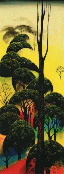 Eyvind Earle made this landscape, Central California, through a process of layering and precision, like building a world one careful stroke at a time. The way he puts the paint down—smooth, almost polished—gives the whole scene a kind of dreamy clarity. Look at how the light seems to glow from within, especially along that winding road. It’s so smooth, it almost feels like you could touch it without disturbing the surface. And those dark, rounded trees? They’re not just shapes; they’re like soft, velvety forms. The way Earle balances these bold shapes with delicate details makes the whole painting sing. The texture isn't rough or gestural, it's all about creating depth and a sense of space. Earle reminds me a bit of Magritte, that same love of clean lines and impossible perspectives. But where Magritte messes with your mind, Earle invites you to lose yourself in a world of perfect, untouched beauty. Art isn’t about answers, it’s about endless looking, endless feeling.