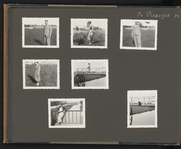Editor: Here we have Herman Besselaar's gelatin-silver print from 1933, titled "Berti Hoppe en haar moeder op de boot van Arnhem naar Nijmegen"—a snapshot of a mother and daughter traveling by boat. The stark black and white tones give it such a vintage feel, almost nostalgic. What do you see in this piece, looking beyond the surface? Curator: I see a potent tableau of familial legacy and displacement. Note the repetitive visual motif of the boat, appearing in a sequence; this repetition signifies a journey, both literal and perhaps metaphorical. The images suggest the women, possibly refugees or travelers in a pre-war Europe on the brink of transformation, experiencing life adrift and in-transit. What strikes you about their positioning in each frame? Editor: I see what you mean, the composition tells a story. The first image shows them together, more connected, whereas in the other two, they’re isolated, almost contemplative. It is poignant. Does the medium - gelatin silver print - add to the meaning for you? Curator: Absolutely. The use of photography as a medium, especially in the 1930s, lends an air of authenticity. Photos were becoming powerful mnemonic devices. Each frame is a visual record but imbued with layers of emotion – hope, uncertainty, and perhaps a quiet strength inherited through generations. The image becomes less a depiction of a boat ride and more a symbolic voyage. What feeling remains with you? Editor: Definitely the bittersweet sense of memory and transience that you pointed out. There's so much packed into these small frames! Curator: Precisely! It’s the beauty of symbols, isn’t it? Seemingly simple images hold vast narratives within, echoing through history.
