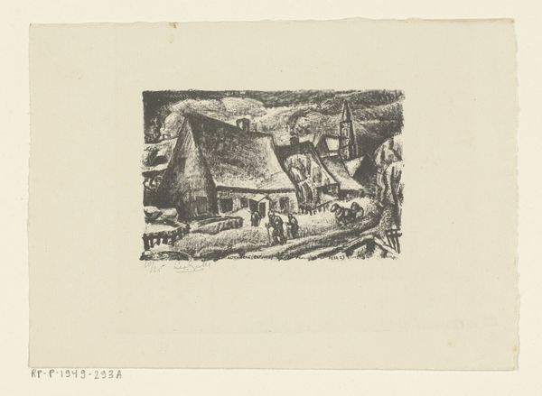 Curator: This etching by Antoon Derkinderen, titled "Farm with Hay Barn," was created in 1887. What are your first thoughts on seeing this piece? Editor: Stark, almost desolate. The etching technique lends itself well to capturing the roughness of the building, the straw, and the overall mood. It’s not a romantic countryside scene; there's a laboriousness depicted here. Curator: Exactly. Derkinderen was interested in portraying the realities of rural life. This piece, being an etching, is about the meticulous work, the repetitive, almost meditative act of creating the image through physical work on the metal plate itself. Look at the density of lines creating the thatched roof and compare that with the open landscape. Editor: It certainly highlights the contrast between human effort and the vastness of the natural world. I'm drawn to the two figures under the roof – their bowed posture is evocative, speaking to the often-unseen labor underpinning agrarian society and gendered labor. Curator: It also speaks to the materiality of everyday existence. Derkinderen shows us the building blocks – the wood, the hay – and transforms them into art. His subject, however, serves the narrative he constructs around the peasantry, a sympathetic outlook in light of rampant urban industrialization and its impact on the agriculture. Editor: The etching is more than a neutral representation, it engages the visual languages with pressing issues of the time period – inequality, marginalization and resilience through rural subject matter. What was accessible and mundane is elevated to an object of analysis. Curator: Ultimately, it makes you think about how we assign value, both to the objects we consume and the labor that produces them. It's a piece rooted in the socio-economic realities of its time but speaks to lasting conversations about class and craft. Editor: A quiet artwork that resonates loudly with socio-political history, challenging us to consider labor, identity, and landscape together.