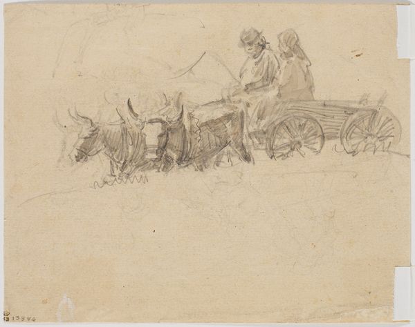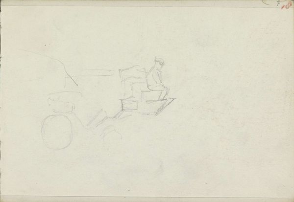 Editor: Here we have "Wachtend koetsje, Berlijn 1888," a pencil and pen drawing by Theo Nieuwenhuis. It's a delicate little sketch, very understated, but it makes me think about the fleeting nature of urban life. What stands out to you about it? Curator: Immediately, the work displays a captivating interplay of line and form. Note the artist’s deliberate choice to render the scene with such visible sketch-work. The marks themselves become a key component, suggesting transience and immediacy. What might initially seem like simple lines become expressive elements, creating texture and depth. Editor: I see what you mean. The lines aren’t just defining the forms; they're building atmosphere, a sense of movement. Do you think that’s intentional? Curator: The very visible construction lines, especially within the trees, point to a clear interest in process. One can almost imagine the artist’s hand moving rapidly across the page, capturing the essence of the scene rather than its precise details. It's fascinating to observe how the artist uses varying line weights and densities to suggest depth and shadow, all while maintaining an economy of means. Consider also how the forms relate to one another. The composition invites a certain circularity; our eye moves from the trees down to the horse, and then perhaps up to the carriage itself. What feelings might this compositional choice elicit? Editor: That's a good point. There's something both restful and quietly dynamic in how it all connects. The eye keeps circulating in a continuous flow. I now understand the construction of this image better, especially the use of lines and composition to emphasize motion. Thanks! Curator: Indeed, the inherent qualities within the sketch open new doors to understanding how it functions aesthetically. Thank you for these intriguing questions!