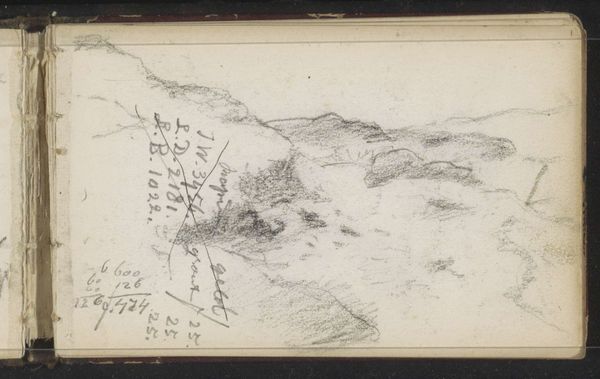 Johannes Tavenraat sketched this pencil drawing, "Zandweg op de heide van Nütterden," likely in the mid-19th century. It depicts a sandy path through the Nütterden heathland of the Netherlands. This work provides an intimate glimpse into the Dutch landscape and the artistic practices of the time. The sketch's loose, informal style suggests it was made on location, capturing a fleeting impression of the scene. Consider how the art academies of the Netherlands at this time, and throughout Europe, emphasized direct observation as the basis for landscape painting. This one departs from the conventions of a finished painting, where the landscape would be idealized. The quick notations and annotations in the margins give us insight into the artist's working process. Understanding this sketch requires exploring the history of landscape painting in the Netherlands, and the cultural value placed on the natural environment. Researching local histories and travel accounts would further illuminate the cultural significance of the heathland Tavenraat captured. This allows us to interpret art not just as aesthetic objects, but as documents of social and environmental history.