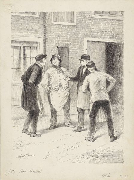 Curator: George Bellows’ "Four Friends," currently residing at the Harvard Art Museums, presents an enigmatic gathering rendered in delicate lines. What impressions does it evoke for you? Editor: Well, immediately, it strikes me as a portrait of nervous anticipation—a pre-game huddle before some grand, perhaps ill-fated, adventure. Curator: The composition certainly suggests a pivotal moment. Notice how Bellows uses the figures' gestures—the hands on shoulders, the bowed head—to create a sense of both camaraderie and unease. Are they offering support, or simply checking the merchandise? Editor: Maybe both? I see a ritualistic checking-in with each other. And the man with the glasses and bow tie, smack in the center, he’s clearly the lynchpin of the whole operation. Curator: The bow tie could signal a formal event, or perhaps an affectation. I wonder about the symbolism of their proximity, the near-touch, the potential intimacy. Editor: There is definitely something secretive, almost conspiratorial, in their huddle. This piece feels like a secret handshake caught on paper. It makes you wonder what they’re really up to, doesn’t it? Curator: Indeed. Bellows captures that ambiguous human space between connection and calculation, and that’s quite arresting. Editor: For me, "Four Friends" is a poignant reminder that even in our closest circles, motivations can be delightfully murky.