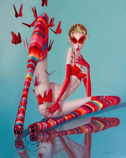 Curator: Standing before us, we have Troy Brooks' "Cloverhead," a compelling painting rendered in a style that blends portraiture with elements of Pop Surrealism. What catches your eye first about it? Editor: Well, that startling combination of fragility and aggressive artifice. The attenuated figure, almost skeletal, with those brilliant, almost lurid, green shoes…it’s unsettling, isn't it? The corset emphasizes this contrast further; are we looking at control, exposure, or both? Curator: I think Brooks here is certainly playing with themes of hyper-femininity and its discontents, especially how these themes play out within visual culture. There's this distinct element of modernist angst, echoing, perhaps, the changing roles of women. The bright pop of the shoes against the otherwise muted tones suggests that this subversion is intentional, perhaps celebratory, and definitely provocative. Editor: Yes, the color acts like a rupture. Considering it, the pale skin and elaborate hair reminiscent of vintage Hollywood evoke symbols of transformation and disguise. Look at the hands, almost claws, they signal both an otherworldly, nymph-like being and the raw underbelly that it's struggling to repress. It’s that internal conflict made visible. The green heels appear almost threatening against her frailty. Curator: That repression that you note may also be a visual strategy aimed squarely at consumerist pressures in culture and commerce. Brooks’ artwork highlights how women and the body become commodities subject to trends and manipulation. The way that a specific beauty ideal gets represented--and internalized--certainly affects us as a viewing public. Editor: Right, her back exposed almost invites inspection, she's turned but looking askance, wary, even distrustful. Her gaze doesn’t meet ours head-on. We are being warned. As a final remark, it is so interesting how a painting, stripped of everything except for this core image, triggers our desire for symbolism and an unveiling of a narrative behind it. Curator: Absolutely. Through his pointed commentary on social norms, Troy Brooks makes us consider our own engagement with imagery that dictates--even demands--our attention.