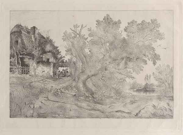 This landscape with trees, a fence, and a bridge was made by Georgius Jacobus Johannes van Os using pen in grey-brown ink, brush in grey, and black chalk. The artist's deliberate use of monochrome, relying on varying tones of grey and brown, accentuates the inherent textures and forms of the natural landscape. Note the intricate details, achieved through delicate pen work and chalk shading. These elements suggest a meticulous process, typical of academic landscape studies of the period. The use of chalk lends a softness to the scene, capturing the play of light and shadow on foliage and water. But the medium also tells another story: the increasing professionalization of art, where studies like these were a commodity, bought and sold. The artist’s skill is evident, but so too is the labor required to produce such a refined drawing. Ultimately, understanding the materials and techniques employed by van Os provides a richer appreciation of the work. It challenges us to look beyond the picturesque scene.