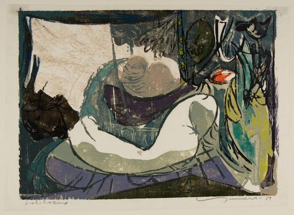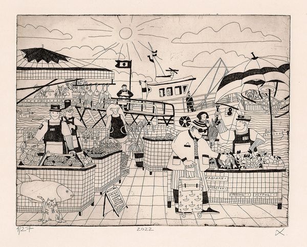 Curator: This is Julian Trevelyan's "West Wind," a print now residing in the Tate Collections. Editor: Immediately, the graphic quality strikes me. Silhouetted figures, boats scattered across the water, and an overarching sense of movement. It feels almost allegorical. Curator: Trevelyan was deeply involved in the British Surrealist movement and later embraced printmaking. The etching process allowed him to explore texture and layering, creating a sense of depth. Editor: The bridge in the background—is that a symbol of transition or connection? The birds, the wind itself, all suggest a journey. Perhaps emotional, perhaps physical. Curator: One could also consider the etching's materiality; the ink, the paper, the very act of pressing the image. How labor transforms into a commodity for consumption. Editor: Maybe, but for me, the image feels more deeply personal. It's a snapshot of memory, filtered through the lens of symbol and feeling. Curator: I see your point. The domestic scene juxtaposed with the open water creates a compelling tension. Editor: Exactly! A visual poem about home and away, stillness and motion. Curator: Considering both the production and the potent symbols, this image resonates on many levels. Editor: Indeed, it captures something essential about the human experience.