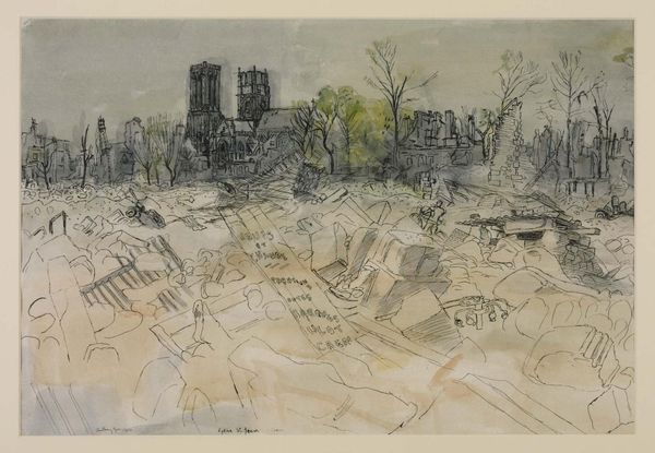 Curator: John Marin’s watercolor and drawing, “Upper East River, New York” from 1935, gives us an interesting perspective of the city during a dynamic era. Editor: The eye certainly bounces all over the place, doesn't it? There's a vibrant energy but also a muted, almost melancholic wash to it. The geometric structures of the buildings stand in stark contrast to the fluidity of the water. Curator: It's reflective of Marin's engagement with the urban landscape. He sought to capture not just the appearance, but also the feeling and tempo of modern life in New York. The East River was crucial for the industrial activities of the city at that time, a place of constant coming and going. Editor: Yes, and it's rendered here with such a loose hand. The lack of clearly defined forms creates a sense of dynamism, of the city as perpetually in motion. Notice how the red accents draw the eye, giving vibrancy to a city usually painted with grit. It nearly becomes a feeling. Curator: This approach certainly echoes modernist styles like Impressionism but with a distinct American accent, focused less on light and more on capturing the restless spirit of the city, post-Depression era. You see similar scenes depicted by other members of the Stieglitz circle who shared an interest in the American urban experience. Editor: Thinking about those red accents, they are so cleverly placed to lead us through the composition. And that interplay between the geometric forms and more organic, almost chaotic lines of the river gives such wonderful visual tension. Curator: Absolutely. Marin saw New York not as a static subject but as a vibrant social space that's captured in all its frenetic energy. Editor: This certainly highlights how a city, seemingly cold and impenetrable, could be rendered with so much palpable sensation. Curator: A sensation rooted in reality, a unique perspective into the narrative of urban change, wouldn’t you agree? Editor: Definitely. It is fascinating how much Marin’s style extracts the feel of the epoch from the geometric shapes and color use. It becomes more than just visual recreation.