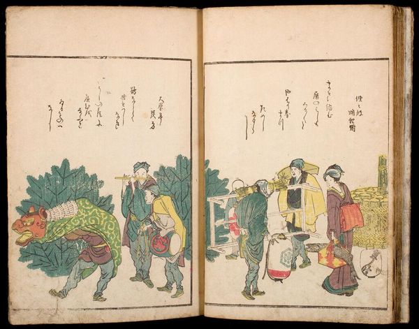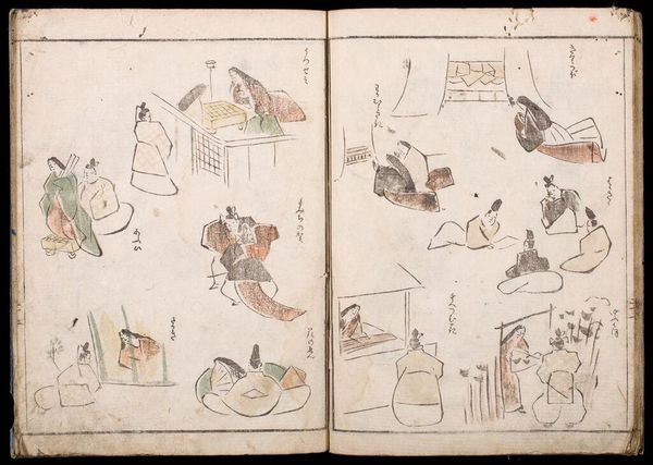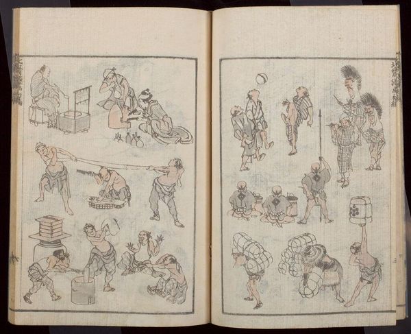 Curator: Let’s turn our attention to "Manga", a woodblock print housed here at the Guimet Museum. This piece exemplifies Hokusai's command of line and form, a testament to the Ukiyo-e tradition. Editor: My first thought? Weariness. Look at those figures, hunched and toiling. There's a stoic, almost poetic, quality to their labor. Makes you wonder about the unseen narratives behind these faces. Curator: Indeed. Notice how Hokusai uses dynamic line work to depict the figures. Their postures suggest an almost choreographic arrangement. The realism with which the figures are represented lends credence to its genre-painting roots, effectively capturing the day-to-day activities of common people. Editor: The repetition, though – it strikes me as both monotonous and meditative. Is that the point, perhaps? The cyclical nature of labor, etched into the very composition itself? There is an innate sense of grounding here as well as visual realism and detail. Curator: Structurally, the print achieves a delicate balance. The negative space interacts harmoniously with the populated areas, preventing the scenes from feeling overly dense. Consider, too, the visual semiotics at play in the work: how each element contributes to our understanding of work, perseverance, community. Editor: It almost feels like a documentary of the soul—revealing the gritty textures of existence without romanticism or embellishment. Despite all the detail that has been rendered here it's as if the bare bones of laboring life have been revealed. What if each scratch represents a memory or the passing of another minute? Curator: Hokusai presents us with an unvarnished look at labor. We have a scene where one may even say a sugar press appears as we view it from a modern vantage point. It's this kind of close observation married with impeccable artistic execution that elevates "Manga" beyond simple genre scenes into a broader exploration of the human condition. Editor: Looking at it now, I see not just weariness but a strange kind of beauty. A tribute to quiet dignity and the silent stories etched into working hands. I'm seeing this scene now in a more celebratory light, and it is that interplay of impressions that makes it even more sublime.