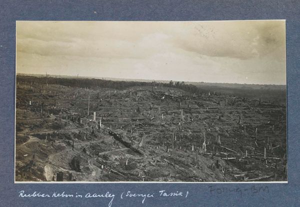 This photograph, "Aanleg van een rubberplantage van de Deli Maatschappij bij Soengei Tassik op Sumatra", of a rubber plantation being established, probably documents some dark moment from long ago. The photograph is small, and the grayscale enforces a sense of something muted and incomplete. This image feels like a drawing, with an emphasis on tonal variation. It's almost like a drypoint print, with the scratched marks and the heavy shadow lines, but it’s a photograph. I get the sense of light reflecting off the cleared land, contrasting with the looming, untouched forest in the background. The texture of the land is rough, broken up by the stumps and scars of what was there before, like a fresh canvas ready for a new image. I’m reminded of some of Anselm Kiefer’s landscapes, although they come from completely different contexts. What links them is how each artist uses texture and tonal range to convey a story about time, labor, and the transformation of the landscape. This piece is an unromantic view of human impact and the constant negotiation between nature and human industry, which is a conversation that echoes through art history.