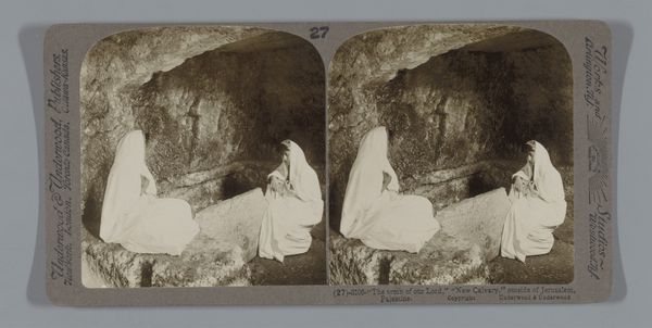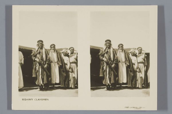 Curator: Before us we have "Vrouw bij de muur van Shishak, beschreven als "een moderne Delila," a photograph from 1929, made using the gelatin silver print process. The photograph is the work of Richard St. Barbe Baker. Editor: It's arresting! Stark contrasts of light and shadow dominate, really emphasizing the texture of that ancient wall behind the figure. I'm curious, what were the common uses for gelatin-silver prints back then? Curator: Well, photographs such as this were vital in shaping Western perceptions of the Orient during the early 20th century. Baker wasn’t just taking snapshots, he was participating in a dialogue about power, gender and exoticism that resonated deeply with his contemporaries and still compels analysis today. Editor: I see your point. The wall itself looks almost like raw, unfired clay—but monumental in scale. Given that gelatin-silver was an inexpensive material process at the time, did it help circulate Orientalist imagery more broadly? I wonder how different segments of the public received it then versus how we process these images now. Curator: Exactly. Consider the woman depicted. Dressed in what seems like traditional garb, she stands adjacent a shattered ruin—the "wall of Shishak," according to the caption. The photographic method allowed for the wider distribution of these depictions, influencing colonial policy, anthropological studies, and even popular culture. It fed into fantasies and promoted inequalities simultaneously. Editor: And that's where I see this "Modern Delilah" theme playing out! I almost missed it, but the photograph actually uses stereoscopic display by offering slightly different perspectives across its two photographic planes. Curator: Ah, a fitting observation! The technical element enhances the overall mystique, doesn't it? Editor: I think so! This has really opened my eyes to the powerful interplay of artistic choices and historical context within this piece. Curator: Likewise! Seeing it through a material lens adds new depths. Thank you!