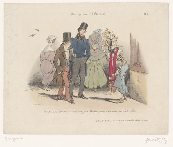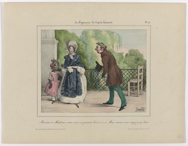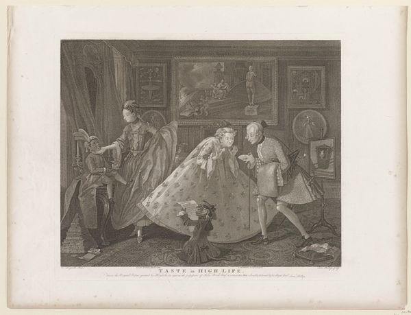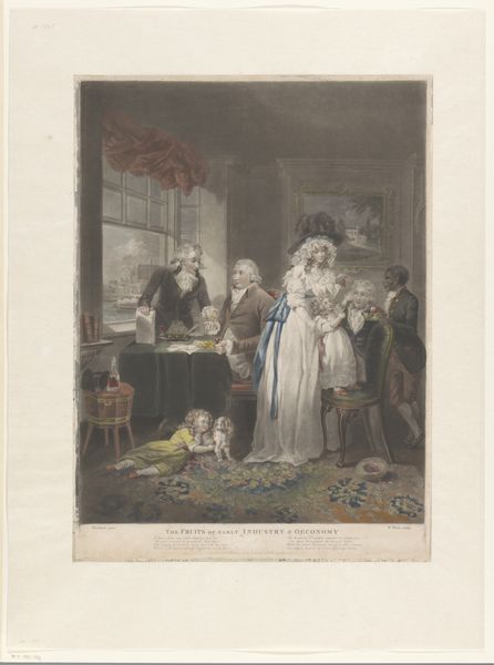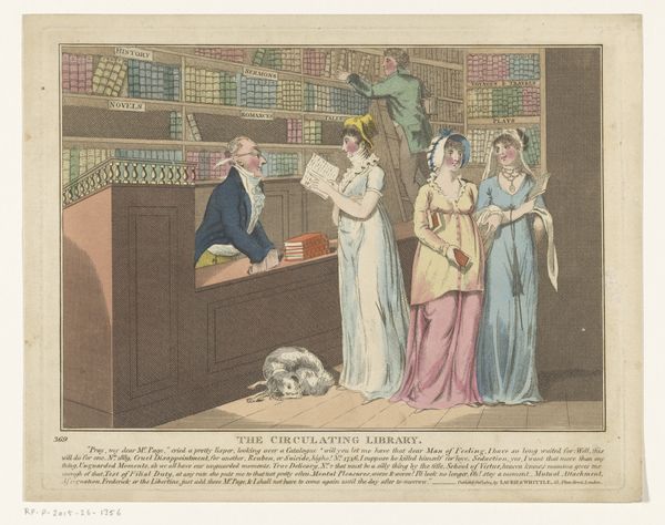 Thomas Rowlandson, a prominent figure in British satirical art, created this watercolor print titled 'Doctor Syntax wordt aan een vrouw voorgesteld'. It captures a scene of courtship, set against a backdrop of scholarly pursuits and social expectations. Rowlandson was active during a time of significant social and political change, with shifting class structures and evolving gender roles. His work often reflects these tensions through humor and caricature. In this print, we see the formal introduction of a man, presumably Doctor Syntax, to a woman in what appears to be a well-to-do household. The setting, filled with books and adorned with art, speaks to the importance of education and refinement in courtship during this period. The presence of onlookers, both in the foreground and peering from above, underscores the performative aspect of courtship, highlighting how societal norms and expectations shaped individual interactions. The artwork prompts us to reflect on the ways in which gender, class, and social standing intersect in the rituals of courtship. Rowlandson invites us to consider the humor and absurdity of these interactions, offering a glimpse into the complexities of human relationships within a specific historical context.