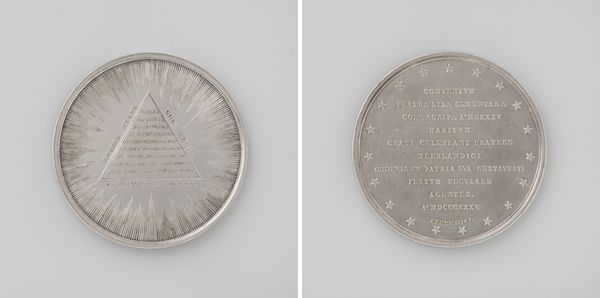 Editor: This metal relief, titled "Ter ere van de gesneuvelden in september en oktober" or, "In honor of those fallen in September and October," and thought to be made around 1830 by Adrien Hippolyte Veyrat. The details of the engraving look so precise. How do you read the symbolism of the composition? Curator: We need to think about the materials here: metal, painstakingly engraved to produce multiples. Consider the labour, the industrial processes involved in circulating this message widely. Note the democratization of commemoration, using a medium readily reproducible compared to, say, painting or sculpture. Editor: That's fascinating. So, the choice of metal speaks to its availability and the desire for broader reach. Curator: Exactly. What social function is served by this accessible form of mourning? The pyramid on one side is itself interesting, as a Neoclassical symbol referencing permanence, inscribed with text. But that weeping willow… Do we consider its symbolism outside the social, outside the mode of production? No! It underscores the sanctioned emotional landscape that is being distributed and internalized through this commemorative object. Editor: So it is the material’s accessibility in terms of distribution, that brings it beyond being just an individual’s memorial, to a communal understanding of loss? Curator: Precisely! These objects weren’t just aesthetic experiences; they actively shaped public sentiment, memorializing not only fallen heroes, but solidifying ideals of nationhood that could be easily disseminated in 19th-century Belgium. What does this labor of commemoration do, and for whom? Editor: I hadn’t thought about it that way before, seeing it less as a passive art piece, and more as active participant of defining national identity, produced by a specific labor process. Thank you for illuminating the connections. Curator: My pleasure. Now we have a better view into what this piece really represents.