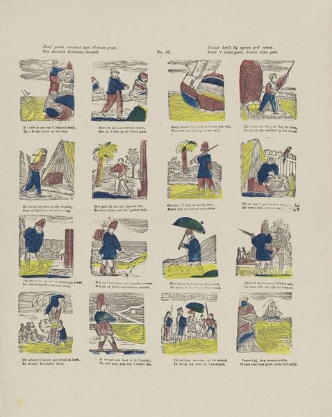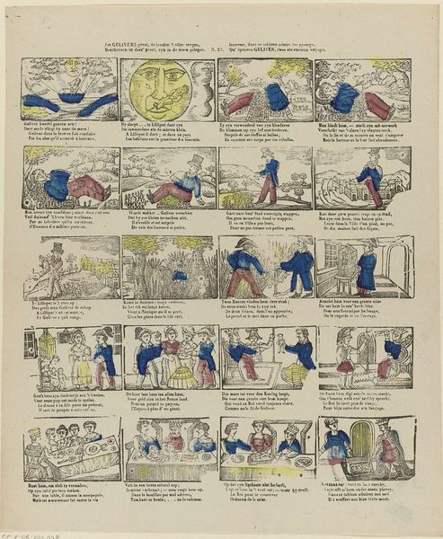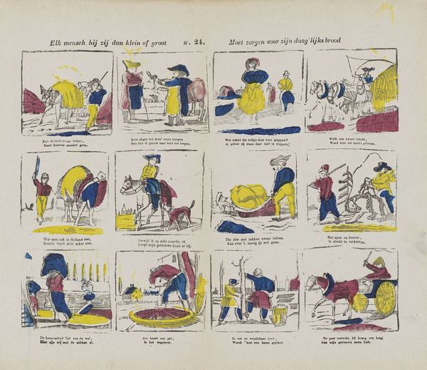 This hand-colored print, titled "Opwekking aan de lieve jeugd," or "Awakening to the Dear Youth," was created by Lutkie & Cranenburg in the Netherlands. The print presents a series of moralizing scenes aimed at guiding young people towards virtuous behavior. Each vignette depicts a scenario with an accompanying verse, reflecting common themes in Dutch culture such as diligence, piety, and respect for authority. The image creates meaning through its emphasis on social roles and expectations, particularly those related to childhood and education. The print may have been commissioned by religious institutions or schools, intended to reinforce specific values. Further historical research, including examining educational materials and religious texts from the period, could provide deeper insights into the social and institutional context in which this print was produced and consumed. The meaning of this art is contingent on the period in which it was made and what norms it sought to promote.