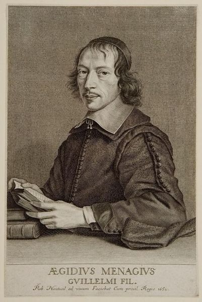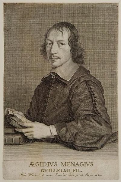 Curator: What a meticulously rendered engraving! Robert Nanteuil created this likeness of Gilles Ménage sometime between 1647 and 1657. It's a testament to the precision achievable through metal plate engraving. Editor: My first impression is of thoughtful restraint. The gray scale, while expected for an engraving, evokes a certain scholarly seriousness. It’s more contemplative than celebratory, wouldn’t you agree? Curator: Absolutely. The composition, for instance, relies on balance and quiet observation. The figure of Ménage is centrally positioned, but it's the details of his attire, the subtle gradations in the background, and the text below, that coalesce into an image of intellectual bearing and self-possession. Editor: Tell me more about that inscription. What does it say about Nanteuil's engagement with portraiture during this era? Curator: The inscription dedicates the portrait, identifying Ménage and noting that Nanteuil drew him from life, under royal privilege around 1652. The claim that Nanteuil worked ad vivum underscores the work's representational purpose, but the artist transforms mere visual record into something expressive of Ménage’s status within a particular cultural moment. It speaks volumes of the subject's identity as one validated by association with the Crown. Editor: I'm also drawn to how Ménage is depicted with a book in hand—an object acting almost as a character in the work. It reinforces a kind of constructed identity through symbolic props, typical of official portraits produced during the Baroque era. The books act not just as decoration but also highlight Ménage's literacy and cultural role. Curator: Precisely. Notice, too, the layering of forms: the books, the hands, the carefully patterned texture of his robe, all arranged to create an image that encourages careful, sustained looking. The artist wants you to study the textures in this. This is why the artist provides such detail. Editor: I can definitely agree with you on that. Curator: Considering the piece as a whole, Nanteuil invites a deeper appreciation for how social positioning shapes self-presentation through visual culture. Editor: And on my end, focusing on the artwork itself—on how those textures and details play off against the restrained palette—reveals a consciousness aimed to elicit contemplation about this historical person and moment.