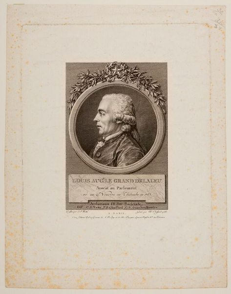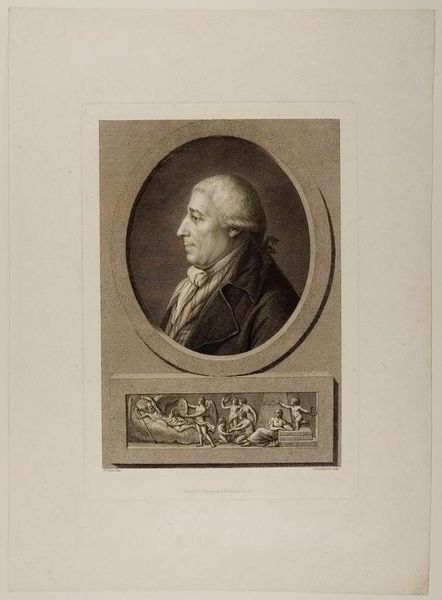 Editor: This print depicts Francesco Bartolozzi. It’s by Jacques Bouillard, and it’s currently at the Harvard Art Museums. I’m curious about the imagery below the portrait. How do you interpret the figures in the relief? Curator: They are representations of classical antiquity, mirroring the revival of classical ideals during the Enlightenment. Note how the figures below seem to echo the sitter's own artistic values, creating a symbolic link. What cultural values do you think this image is trying to convey? Editor: It seems to value history, intellect, and maybe a kind of timelessness? I hadn't considered how the relief might connect directly to Bartolozzi himself. Curator: Precisely! The visual language evokes a sense of cultural memory, placing Bartolozzi within a lineage of artistic achievement. It's a fascinating dialogue between portraiture and symbolic representation. Editor: I'll definitely look at portraits differently now, thinking about the symbols they employ.