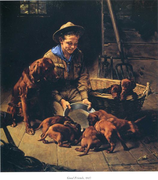 Editor: This is "Hobo and Dog" by Norman Rockwell, painted in 1924. It's an oil painting, and there's a tenderness in the depiction of this man sharing his meager meal with his dog. It's quite touching, but also a bit romanticized, wouldn’t you say? How do we understand Rockwell’s image in relation to the historical context of poverty it depicts? Curator: You've touched on a critical point. Rockwell often presents an idealized view of American life, which certainly has socio-political implications, particularly in the depiction of class. While ostensibly showing a scene of simple sharing, it is crucial to remember this image was created following World War I and reflects the lingering societal anxieties around class divisions and labor shortages. Editor: So, it's not just a charming scene, but potentially a comment on something deeper? The "Yankee" newspaper tucked beside him – does that tie into this in some way? Curator: Precisely. That newspaper and the date signify a period of increased nationalistic sentiment alongside economic hardship for many Americans. Rockwell positions the "hobo" not as a societal problem but as an individual worthy of empathy. Consider, though, how this image circulates and whom it serves. Does it encourage meaningful dialogue about the systemic issues causing poverty, or does it reassure a more affluent audience? Editor: That makes me see this in a whole new light. It's a beautiful image, but I appreciate the deeper socio-political considerations we need to make. Thanks! Curator: Exactly. By interrogating the artwork's historical and cultural context, we reveal its relationship to American society and, potentially, how those visual constructions of poverty might remain today.