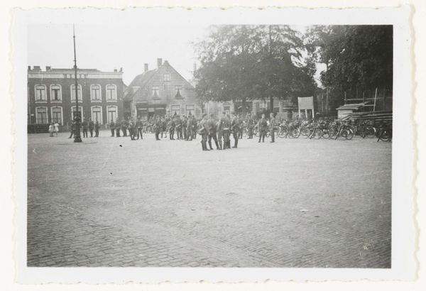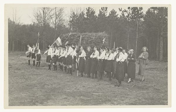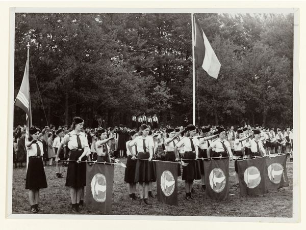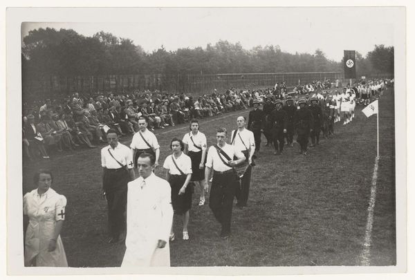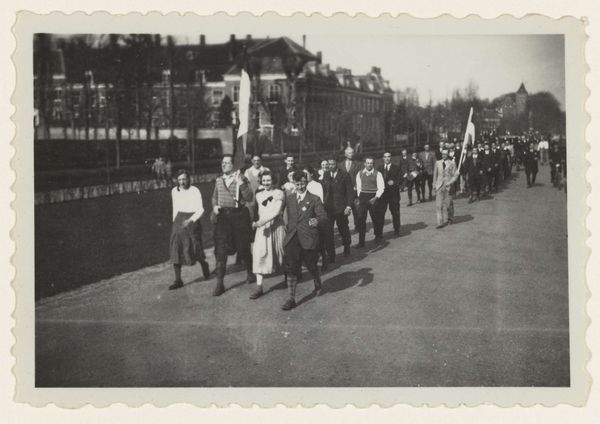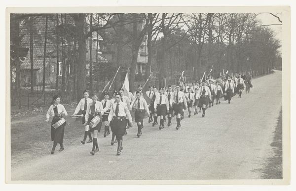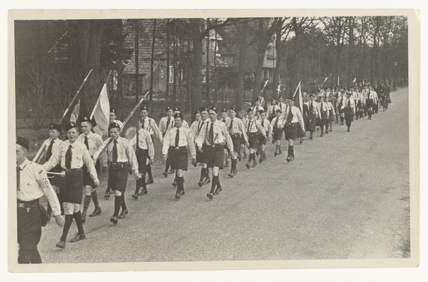 This photograph shows a parade of young men marching in the Netherlands. The image was produced by the Nationaal-Socialistische Beweging, or NSB. The NSB was a Dutch political party that collaborated with the German occupying forces during the Second World War. The photograph depicts members of the Jeugdstorm, the NSB’s youth movement, as they march through a Dutch town, and the organization was modeled after the Hitler Youth in Germany. The flags and uniforms create a sense of order and discipline, reflecting the NSB's desire to instill a sense of national pride and obedience in young people. The image seeks to legitimize a political movement through a demonstration of strength. Understanding the historical context of this image—the rise of fascism in Europe and the collaboration of the NSB with the Nazis—is essential for interpreting its meaning. Further study of the NSB’s propaganda efforts helps us understand how they sought to shape public opinion and mobilize support for their cause.