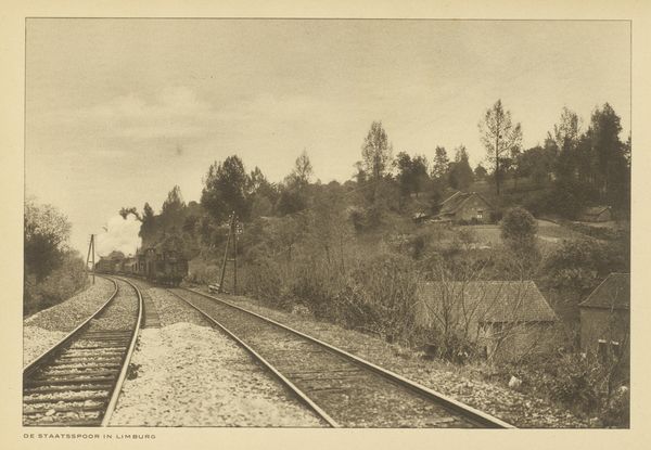 Curator: William H. Rau's "Hemlock Run Curve, Near Towanda," a gelatin-silver print from approximately 1895, presents a landscape dominated by converging railway tracks. Editor: My first impression is one of impending movement or potential, emphasized by the monochromatic sepia tones lending an almost dreamlike, historical gravity. Curator: Absolutely. Rau uses pictorialist techniques to soften the scene. Note the limited depth of field and gentle contrasts; he prioritized evoking an atmospheric mood over sharp, documentary detail. Editor: This approach softens the impact of what is essentially a symbol of industrial encroachment. We're presented with the picturesque beauty of nature, almost negating the violent imposition of the railroad on these indigenous lands and communities. Curator: But isn’t the formal composition compelling? The curving tracks, their vanishing point offset, creates visual interest and implies movement beyond the frame. Note also the way the landscape on the left serves to highlight the right's view across water and land. Editor: Perhaps the eye is meant to wander, yet the photograph does subtly monumentalize colonial presence and dominance in the guise of progress; those telephone poles standing tall and confident, stringing across the horizon, are stark in their suggestion of erasure and cultural imposition. Curator: That may be true, yet focusing solely on that risks overshadowing how effectively Rau utilizes photographic techniques to achieve a particular aesthetic effect. He transforms what could have been a stark, industrial document into a more meditative view of the land. Editor: And the very definition of ‘meditative’ might be interrogated too, framed within the displacement enacted through industrialization; nonetheless, by opening up multiple avenues of thought, the art provides fertile ground for conversation. Curator: I agree. The artistry here lies in its capacity to prompt various viewpoints simultaneously, as a complex testament of its time. Editor: Leaving us to grapple with those dual realities today, which hopefully sparks conversation about the future, too.