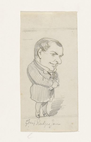 Editor: This is a pencil sketch from 1887 by Johan Michaël Schmidt Crans, titled "Schets voor karikatuur van kamerlid L.W.C. Keuchenius", which roughly translates to 'Sketch for caricature of parliament member L.W.C. Keuchenius.' I’m immediately struck by the looseness of the lines and how that contributes to the overall satirical mood. What can you tell me about this piece? Curator: This sketch exemplifies the material conditions of caricature and its role in social commentary. Consider the medium itself: pencil, readily available, inexpensive, easily reproduced. This lends itself to quick creation and dissemination, key for timely political critique. How might the choice of pencil over, say, oil paint, influence the accessibility and impact of the caricature's message? Editor: I hadn't thought about it that way! It makes perfect sense. The very act of creating a quick pencil sketch, something reproducible and shareable, democratizes the art form. I guess I was too focused on the subject and the implied political commentary. Curator: Exactly. Furthermore, explore the production of images like these during that time period. Were they circulated in newspapers? Broadsides? Think about the relationship between artistic labor, print culture, and the consumption of political satire. Who was the intended audience and how did the material nature of the sketch contribute to reaching them? Editor: I see... so, the materiality is crucial for understanding its societal role back then. And today, that rough quality almost humanizes the subject, paradoxically adding a layer to its social criticism. Curator: Precisely! The means of production shaped its consumption and the accessibility of its social commentary. Considering that the artistic choice emphasizes dissemination and not permanence, it shifts the traditional understanding of art objects. Editor: I always focused on interpreting the caricature's subject, not the material implications. That definitely changed my perspective. Thank you! Curator: Likewise. Looking at the production and dissemination of art truly unveils so much about a society and its values.