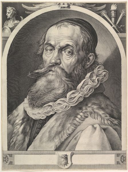 Curator: This engraving by Wierix, predating 1600 and now housed in the Rijksmuseum, presents us with a portrait of Wilhelmus Boonaarts, also known as Fabius. My immediate response is that of confrontation; his gaze is quite direct, almost accusatory. And the skull…it's quite a striking, unsettling element. Editor: I agree. There's a starkness, an unyielding directness in his posture and the intensity of his gaze, amplified by the monochromatic nature of the print. But I see the skull less as unsettling and more as a statement. This was a period of great intellectual and religious upheaval; perhaps the skull represents mortality in the face of humanist philosophy? Curator: Exactly! Contextualizing this piece, the symbols aren't randomly placed; there's purpose in everything. Look above; the image includes Latin script along with allegorical devices like a globe, figures with wings, and what appears to be an image of a crest. Everything contributes to portraying this man. How do you think the social and political currents of the late 16th century affected the portrayal of scholars? Editor: Well, the rise of printmaking allowed for a wider distribution of images and ideas. So, portraits of learned men like Boonaarts, distributed as prints, helped construct a public image, celebrating intellectual achievement. Think of it as a carefully constructed form of branding – connecting individual fame with virtue and knowledge, which then, I assume, links to the influence held by these scholars and by association their fields of expertise and patrons. I suspect also that this is an attempt to show their dominance during a period of uncertainty, the presence of the skull possibly being to show Fabius’ awareness. But why make a printed edition versus a painting? Curator: Access. It’s critical to remember that paintings of such prestigious individuals would be exclusively viewed by wealthy art collectors, nobles, royals, or wealthy institutions that were interested in projecting power. In that light, who do you suppose the message inscribed at the bottom would have been intended for? Editor: Given Wierix's technical skill in engraving, evident in the fine lines and textures, and the relatively broad dissemination of prints during the period, it becomes evident how effectively these portraits reinforced and upheld the period's rigid social structure and cultural values. He wasn’t merely copying images, but in reinforcing those images and what they represented as truth. Curator: Yes. By understanding the printmaking industry of the time, as well as reading between the lines (literally) to discern underlying societal standards, our comprehension is increased beyond surface level, which is a lesson everyone should take to heart when viewing historical artifacts. Editor: A compelling reminder that art, even portraiture, serves as a lens through which we examine and question power and the status quo, hopefully for generations to come.