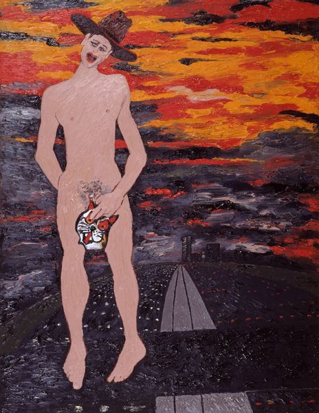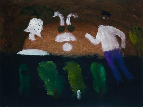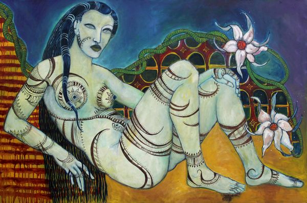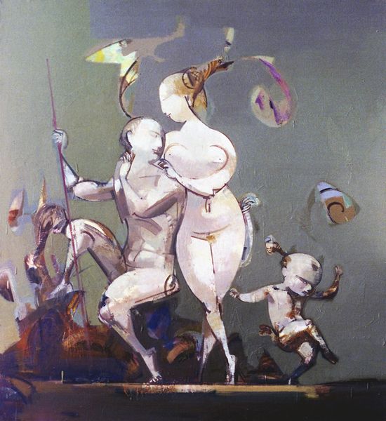 Vasiliy Ryabchenko created this large-scale painting, titled ‘Love - not love,’ with oil on canvas, using strong brushwork. The paint is applied with different levels of thickness in each area of the painting, giving it a palpable materiality. Ryabchenko employs distinctive textures to draw our attention to the figures, while the background is flatter and less defined. Note the contrast between the smoothed, blended areas and the thickly applied sections which add depth and volume to the subjects. The dark foundation is built up in layers, creating a complex surface. This active engagement with the material invites us to consider the artist's physical involvement in the making process. The use of oil paint, a traditional medium, contrasts with the more contemporary subject matter, sparking questions about the artist's intentions and the dialogue between tradition and modernity. Ryabchenko emphasizes the importance of materiality and making, blurring the boundaries between fine art and craft.