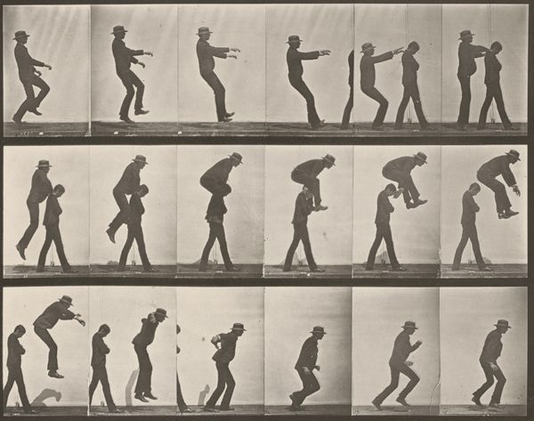 Curator: Editor: Looking at Eadweard Muybridge's "Plate Number 336. Boxing, open hand" from 1887, rendered as a gelatin silver print, it strikes me how modern it feels. The grid of images almost resembles a flip book, dissecting movement. What are your initial thoughts on this photograph? Curator: The dissection of movement you mention is precisely what interests me. Forget about the artifice of “art” for a moment. Consider the labor: the posing, the setting up of the camera, the darkroom processes to produce these prints. These bodies are materials being manipulated in service of scientific inquiry, a form of work, no different than working in a factory. What is being consumed and who is benefiting? Editor: That's fascinating! So, it's less about the aesthetic quality of the images themselves, and more about the act of creating them and the broader social context in which they were made? I hadn’t considered that. It challenges this notion of photography solely as capturing “reality,” if that makes sense. Curator: Precisely. The "reality" here is a constructed one. The photographic process, from the sensitivity of the gelatin silver to light to the manual labor involved, shapes our perception of these actions. What is the value, and how does the means of its production create that value? Consider, how did the printing press, an earlier form of mass image production, influence societal values? Editor: I guess it encourages you to question the choices and manipulations embedded in even what seems like a straightforward visual record. What did Muybridge hope to achieve showing the motion? Curator: Indeed, we can think of it as a system of visual consumption driven by Muybridge's ambition. Did he commodify their labor to further his career, publishing findings, and influencing our understanding of motion? Also, what scientific questions are they trying to solve here by showing "Boxing"? What "real world" issue is the production of the photo attempting to answer? Editor: This reframing is incredibly helpful. I’ll never look at a Muybridge photograph the same way again! Thanks. Curator: I think this lens allows us to consider more than what we perceive on the surface and rather what is physically embedded in art and photography practices, which offers an excellent opportunity to learn about society.