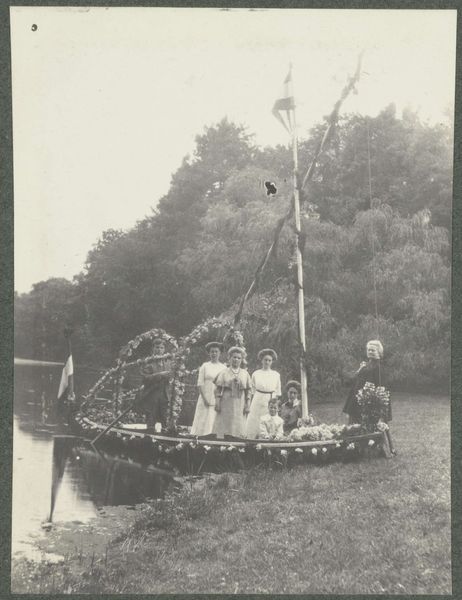 Curator: Here we have Geldolph Adriaan Kessler's photograph, titled "Group of Men by a Decorated Boat on the De Paauw Estate," dating back to around 1913. It's quite an interesting image. Editor: It feels almost theatrical. The desaturated tones lend a sense of formality, and the boat—so meticulously adorned with what looks like flowers—gives the impression of a carefully staged tableau rather than a candid snapshot. Curator: Exactly! Kessler was capturing a particular moment, loaded with symbolic meaning. The boat itself, beyond being a boat, represented progress and journeys. In this setting, it might symbolize a rite of passage for the men featured. Note the contrast: nature’s organic forms behind it with its artifical ornamentation. Editor: And who are these men? Their posed stillness, their near-uniform attire, there is a tension between community celebration and… and perhaps something more? Is it simply about civic pride, or is there an element of social hierarchy on display, given it's happening on an estate? Curator: Undoubtedly, class is relevant. The De Paauw Estate was the playground for elites. The photograph encapsulates that intersection of leisurely pursuit and possibly some kind of societal structure within that. Look at how carefully the garland and rigging and sail are made! Flowers possess symbolism. Editor: So, is it about presenting an ideal, constructing a vision of unity, perhaps even eliding underlying inequalities by representing themselves in front of progress and prosperity symbolized by this decked-out vessel? Curator: Very insightful. We are left questioning if they are truly celebrating or perhaps constructing an image of prosperity amid more complex realities. It's both a collective portrait and an artifact that hides certain dynamics in plain sight. Editor: Looking at the forest behind them. Its dense nature creates an almost fairytale backdrop. It underscores how constructed and artificial the whole setting is—it reveals the very performance happening. It becomes a fascinating commentary on representation, doesn't it? Curator: It truly does, framing these men—and by extension, a fragment of Dutch society at the time—within a specific narrative of prosperity and orchestrated display, preserved forever within Kessler's lens. Editor: Kessler provides a lens, I would argue, that's multifaceted—revealing constructed identities while prompting consideration of hidden elements of that construction. Fascinating piece, nonetheless!