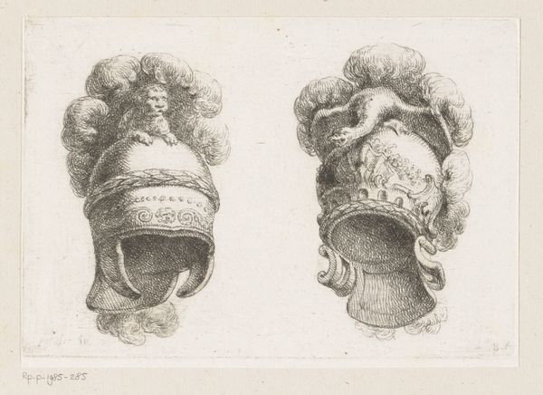 This print, "Two Helmets," was made by Christian Bernhard Rode, and is currently held in the Rijksmuseum. It presents a study in form and ornamentation through its detailed depiction of two helmets. The composition is divided simply, each helmet rendered with meticulous cross-hatching that gives depth and texture to the monochrome surface. Note how Rode uses line to define the contours and details of each helmet, from the plumes atop to the visors and decorative motifs. The helmet on the left features classical elements such as a laurel wreath, while the one on the right showcases more elaborate, swirling patterns. The contrast between the smooth, rounded surfaces of the helmets and the feathery plumes introduces a visual tension. This tension invites us to consider how these elements interact, not just aesthetically but also culturally. Each helmet exists as a signifier, alluding to ideals of valor, status, and martial prowess. Rode’s focus on detail and form underscores a fascination with the semiotics of objects.