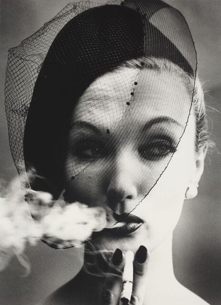 Editor: Here we have Nan Goldin's "Christmas at The Other Side, Boston," a gelatin-silver print from 1972. The contrast is striking. The image features two figures; one is an illustration, the other a live person. It gives a feeling of old Hollywood glamour, and I wonder what was Nan Goldin thinking about with this diptych? Curator: Let’s think about Goldin’s process here. It's a photograph of an existing image and a person. The ready-made photograph or advertising print juxtaposed with this glamorous figure becomes a key point. Are we consuming identities, creating personas through these readily available images and clothes? Editor: That makes sense. So the photograph isn't just about the *subject* but the means by which that subject presents themself. Are you saying there's commentary on how identity is manufactured? Curator: Exactly! Goldin is engaging with ideas of self-construction through the act of photographing an encounter with pre-existing images circulating in society. She draws attention to the act of production – both photographic and of the persona. Even the high-contrast, grainy gelatin-silver print, a process itself, reinforces this. Think about the labour involved in printing and then comparing it to the perceived effortlessness of a readymade image. Editor: So, Goldin isn't just capturing a moment; she's showing us the layers of production and consumption that go into constructing an image, and by extension, an identity. It’s fascinating to think about those tensions between glamour and process, readymade and craft! Curator: Absolutely, considering Goldin’s contribution to photographic traditions this tension emphasizes the impact and importance of photography. Editor: This really reframes how I see the artwork! I'll definitely be looking at other gelatin-silver prints with this lens in mind.