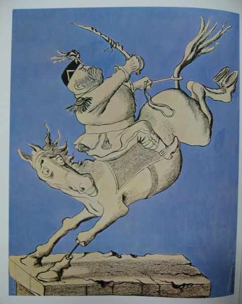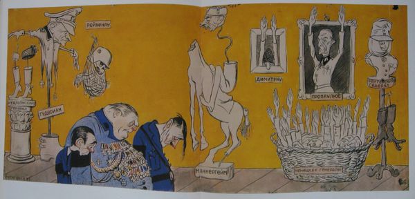 Curator: This watercolor, simply titled "Untitled," comes to us from the Soviet artistic collective known as Kukryniksy, dating back to 1943. What are your initial thoughts? Editor: Well, it’s jarring! That simian figure dominating the composition immediately brings to mind connotations of mockery and primitivism. Curator: Absolutely. Let’s delve into that a bit. Kukryniksy were known for their political caricatures, often targeting Nazi Germany during World War II. Notice how the artist employs watercolor on paper, a medium often associated with immediacy, lending to the urgency of wartime propaganda. The paper support itself is key; it's mass-producible and easily disseminated. Editor: Precisely! Look at the detail embedded within the symbols: The ridiculous stack of hats piled atop the monkey’s head represents the hierarchy of Nazi leadership, diminishing their authority, turning them into caricatures. Curator: The means of representation directly reflect its use as anti-fascist propaganda. Beyond that, note the visual signifiers of power; a monkey wearing Nazi military attire is seated in what looks like a blue-striped throne with a Swastika displayed. Consider the visual contradiction here, an uncivilized figure wearing emblems of power. Editor: And next to the primate, the severed bone evokes decay. I'd suggest that, alongside other components such as the ape figure itself, the bloody bone represents death and decay, alluding to the horrific consequences of Nazi ideology. There's a strong indictment there! Curator: Furthermore, if we view the painting as propaganda, this artwork utilizes and warps cultural symbols for social manipulation, which underscores the insidious and corrosive impact of propaganda and how easily recognizable the Nazi figures were. Editor: It really captures the essence of that period through vivid symbolism and a raw, direct technique. It’s more than just a drawing; it's a powerful message cast in a form intended for the masses. Curator: Precisely, and seeing this artwork really showcases how critical a study of production and consumption becomes to grasping war art. Editor: A truly compelling and discomforting artwork, laying bare the era’s anxieties and hatred through deftly used and charged symbolic shorthand.
