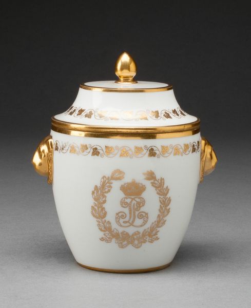 This is the sugar bowl with cover, part of a traveling tea service, made by Dihl et Guérhard. Notice how the piece is dominated by its cylindrical form, refined with an elegant restraint. The structure is defined by its crisp white porcelain, and the gold trim creates a visual hierarchy, segmenting the piece into distinct registers, from the base to the lid. The painted 'B' on the bowl, wreathed in floral garlands, disrupts the regularity and speaks to the object's semiotic function as a signifier of identity and ownership. The repetition of circular motifs—from the spherical knob atop the lid to the rounded handles, and the floral wreath enclosing the initial—suggests a concern with harmony and balance. Consider how the very act of containing sugar transforms a mundane object into a vessel of cultural meaning. The bowl becomes a site where luxury, identity, and social ritual converge.