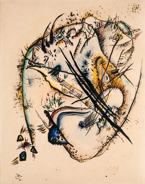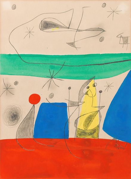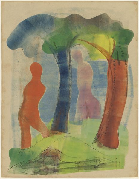 Curator: This is Salvador Dali's "Alice in Wonderland," a watercolour illustration completed in 1969 as part of a series. Editor: It's quite whimsical! The soft watercolour washes give it a dreamlike, almost ephemeral quality. I’m drawn to the biomorphic forms, especially how the clock face becomes an archway. Curator: Dali’s work is, of course, rooted in Surrealism, a movement born from the interwar period in Europe which responded to feelings of instability through imagery of dreams and the subconscious. These Alice illustrations commissioned in 1969 came about due to growing youth culture and the psychedelic exploration and experimentation happening during this time. Editor: Exactly, and consider how the cool greens and blues in the top half contrast with the warmer oranges and browns below. This division emphasizes the tension between the familiar world above, depicted with the tree, and the distorted reality of Wonderland represented beneath it by this, uh, what is it, melting clock shape? Curator: Good eye! The combination of dream imagery, pop culture, and Dalí's artistic celebrity really elevated these images into the collective unconscious. The art world needed some lighter subjects too, during the tumult of this moment in our shared history. Editor: Agreed. What fascinates me is the almost obsessive detail within this fluidity. Note how the tree emerges organically, growing into the top of a U shaped clock, on the inside of which he paints in such detail little teacups and a coffee pot. This contrast amplifies that sense of the fantastical made real, or, rather, rendered tangible through paint. Curator: It's true; a close reading of the composition does reveal Dalí's incredible skills! We could see these watercolour works on paper also as evidence of an artist and market now embracing the mass market in popular books and distribution networks as well as the high-end gallery and museum circuit. Editor: Thinking about the overall composition, it does leave one with the feeling of being invited down a rabbit hole… Or maybe through the looking glass? A masterful representation of what surrealism can offer in its capacity to unsettle and enchant simultaneously.