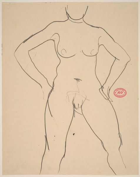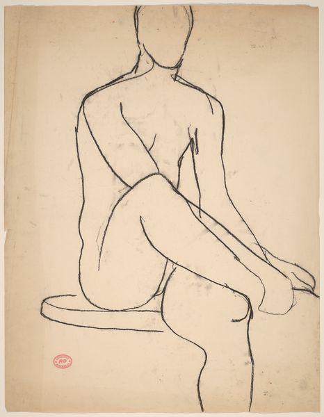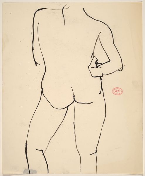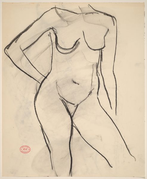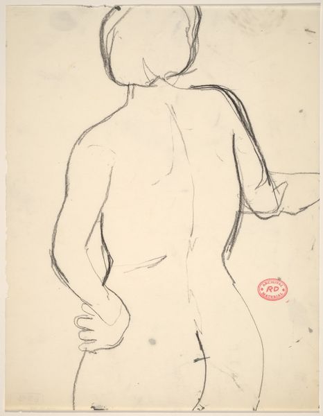 Editor: This is a charcoal drawing by Richard Diebenkorn, made sometime between 1955 and 1967. It's titled "Untitled [rear view of female nude with right hand on hip]." It has such an interesting minimalist feel. The lines are simple, but they convey so much about the form. What do you see in this piece? Curator: Ah, Diebenkorn. Always a pleasure. It’s interesting you picked up on the minimalism. It almost feels incomplete, doesn’t it? Like a fleeting thought captured in charcoal. But within that economy of line, there's such a strong sense of weight and presence. Think about how the hand on the hip creates this almost defiant pose. Do you get that sense? It reminds me of those old Hollywood portraits but stripped bare of all the artifice. Just the raw, human form. It's really interesting! Editor: Yes, I see what you mean! There's a real vulnerability, but also a quiet power in her stance. I find the lack of a defined face really intriguing. It almost makes her more universal, less specific to a time and place. Curator: Exactly. It invites us, the viewers, to project our own experiences and emotions onto the figure. It is like the artist is drawing a map of pure feeling, which might sound corny, but for me it's pretty beautiful. What did you think of it? Editor: It really changed my initial reaction. I just saw simple lines at first, but now I see so much more depth and emotion within that simplicity. Curator: That's the magic, isn't it? That ability for a piece of art to reveal more of itself to you the longer you linger with it. And more of *yourself*!