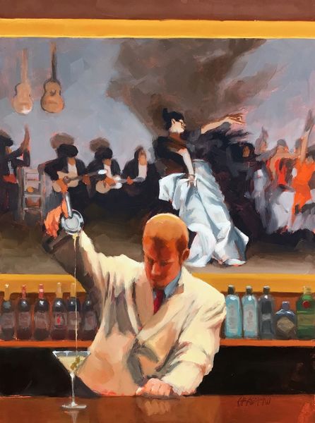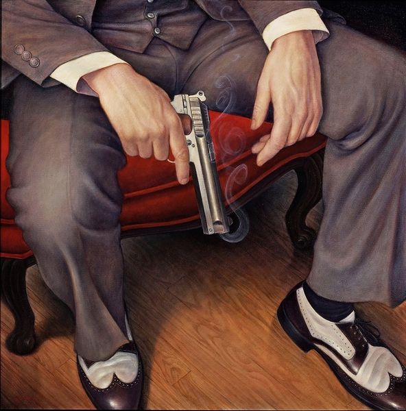 Editor: This is Ernie Barnes’ “Hustler,” an oil painting from around 1978. I’m really struck by the texture of the paint itself, especially how it defines the man’s face and clothing. What do you make of this piece? Curator: Looking at the surface and the materiality is key. Barnes wasn’t just depicting a scene; he was participating in a visual conversation about class, labor, and leisure through his deliberate use of oil paint. What kind of social context do you see represented here? Editor: I suppose the pool hall setting is a clue. It feels very working class to me, like a specific environment of masculine labor…even if the labor is somewhat illicit or unofficial. The man’s clothes, the pool table’s wear…they all contribute. Curator: Exactly! Consider the ‘means of production’ at play here: Barnes' application of paint to canvas acts as his ‘labor,’ mirroring the hustle of the man at the pool table. The oil paint itself, its source, and the social conditions of its consumption also need to be considered. It elevates what some might see as a mundane scene to an arena of complex interactions. Editor: So, it's less about just portraying a scene and more about commenting on the materials that define the situation itself? Curator: Precisely! We see the commodification of leisure and the negotiation of power happening on multiple levels, all represented and, in a sense, performed by the very act of painting with oil. Think of it this way: Barnes’ choice of realism allows him to underscore the tangible, gritty realities of his subject. The material of the painting becomes integral to understanding the hustle it depicts. Editor: I never thought of it that way. It's like the painting's own materiality is part of the story, echoing the themes of the game being played. It's made me rethink how art can communicate on different levels, not just visually. Curator: Indeed. Examining the materiality allows us to dig deeper into how the artwork acts as a historical object enmeshed within specific conditions of artistic and social production.