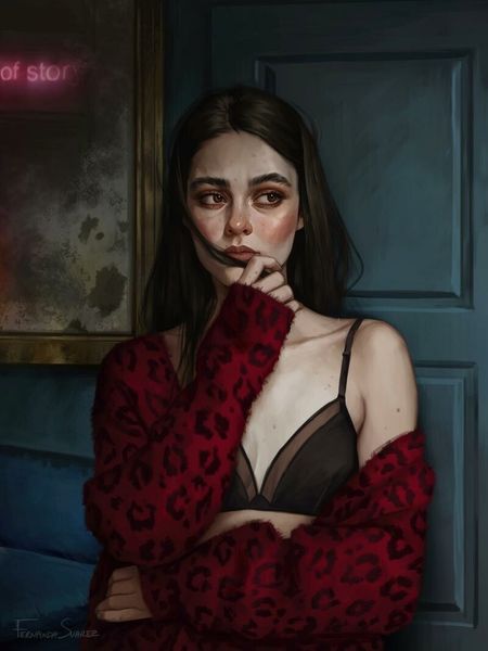 Fernanda Suarez's digital painting invites us into a space of quiet introspection, dominated by a figure rendered in soft, diffuse light. The subject, draped in a floral robe, is framed by a window and string lights. The overall composition, with its muted tones and focus on texture, evokes a sense of intimacy and melancholy. The interplay between light and shadow is crucial here. Note how the artist uses light to sculpt the figure, drawing attention to her gaze. This formal technique is further enhanced by the juxtaposition of warm and cool colours, creating an atmosphere of contemplative solitude. Suarez subtly destabilizes the traditional portrait. By placing the figure in an ambiguous setting and employing a somewhat detached gaze, she prompts viewers to question the nature of presence and absence. The title, "We Were Never Here," adds another layer of complexity. Ultimately, the power of this image lies in its ability to evoke emotion through formal means. It encourages us to consider how such elements contribute to the broader cultural discourse on identity and memory.