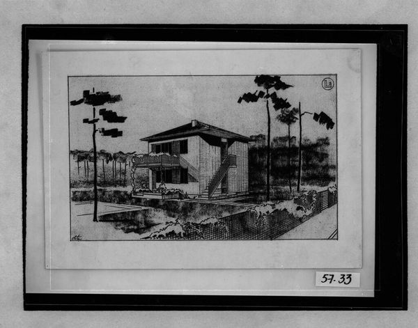 Curator: Let’s discuss Hanns Dustmann's drawing "Prefabricated Copper Houses, 1931-1932: Building type K1: perspective." It's a fascinating look at architectural design of the era. Editor: My first impression is its stark, almost utopian simplicity. The strong lines and minimal shading create a sense of order. Curator: Dustmann conceived these houses during a period of intense social housing debates in Germany. Prefabrication promised affordable, quality living for the masses. Editor: Yes, and the composition emphasizes this. The geometric shapes of the house contrast with the organic forms of the surrounding trees. It’s about integration but also asserting form. Curator: Absolutely, the image highlights the drive for efficient, standardized construction that shaped much of urban development. Editor: Seeing that interplay reminds us of design's power to communicate its intentions. Curator: Indeed. A powerful example of how architecture reflects and shapes our social realities. Editor: And how close looking reveals those intentions!
