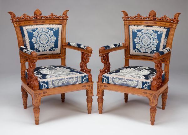 Filippo Pelagio Palagi created this pair of armchairs as part of a larger set, using carved and inlaid wood with fabric upholstery. This furniture provides insight into the world of early nineteenth-century Italian aristocracy and the revival of classical styles. The chairs reflect the influence of ancient Roman designs, aligning with a broader European interest in antiquity. Such styles served as a visual code representing power, taste, and a connection to a glorious past. The ornate carvings and rich upholstery suggest that these chairs were made for a wealthy household. The social conditions in Italy at this time were marked by political upheaval and the rise of nationalism. Aristocrats and other wealthy elites used art and design to express their identities and to align themselves with a specific vision of cultural and political order. By studying estate inventories, design pattern books, and other archival material, we can learn more about the social and institutional contexts of this artwork, and the cultural values it embodies.