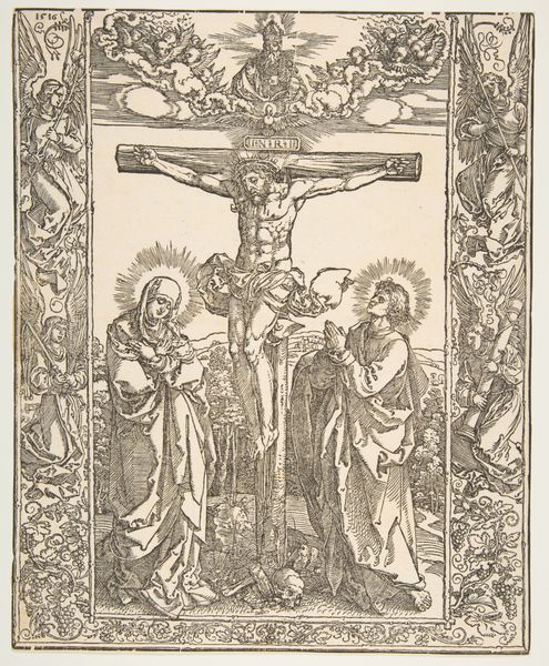 Curator: Immediately, the starkness is striking. The entire scene seems to erupt from the darkness. Editor: We’re looking at Albrecht Durer's "Crucifixion," an engraving created in 1519. Currently, it resides in a private collection, giving us a rather rare glimpse. I find myself drawn to the roundel format and intricate detail given the challenging medium. Curator: It's interesting, isn’t it, how Dürer packs so much emotion into a small space? The circle itself lends a feeling of totality, of inescapable fate. Even the background, formed with dense engraved lines, feels heavy and pressing. This scene, in all its terrible beauty, seems sealed. I see repeated symbolism. Editor: The imagery, of course, draws heavily from Christian tradition. The suffering Christ dominates the center. The skull at the foot of the cross is there as a stark reminder of death. It echoes images used in plague art across the European continent. You feel the tension of religious and social life? Curator: Precisely. And even more specifically it is not simply any death, but Adam's skull that lies beneath Christ’s feet. According to Christian thought, the sacrifice on the cross offers salvation from Adam’s original sin and resulting mortality. It reflects humanity in need. The circular form then amplifies how this moment carries generational salvation that ripples in a closed loop across time. Editor: The figures surrounding Christ are also meticulously rendered, aren't they? We see the Virgin Mary, grief-stricken, alongside other figures traditionally associated with the crucifixion narrative. And on the left we have what looks like the Apostle John. Curator: Consider Mary. The subtle modeling of the cloak does two things. Her sorrow reads powerfully, yet it is familiar as this depiction comes to represent the universal Mother figure. Editor: Indeed. Durer successfully navigates the tension between portraying a specific biblical event and creating a work resonant with wider societal concerns regarding religious, social, and even political matters. It becomes, in many ways, an intersection of sacred history and the everyday reality of its contemporary audiences. Curator: A profound observation. The power of these symbols still resonate today. Editor: Dürer’s technical skill, coupled with potent imagery, results in an enduring depiction. The weight of history is evident.