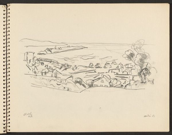 Editor: We're looking at "St. Johns, New Brunswick, Canada," a 1951 pen and pencil drawing by John Marin. It's a sketch, almost like a visual record of a place, captured in a flurry of lines. What jumps out at me is how active the surface of the water feels. How do you interpret this work? Curator: It’s interesting that you focus on the water. Think of water as a symbol, historically speaking: representing fluidity, change, but also depth, the unconscious. Look at how Marin uses broken lines—are they simply depicting the surface, or could they evoke the unseen currents beneath, the history flowing through the city itself? The rapid strokes remind us of art's ability to tap into felt memories, shared histories of a place. Editor: I see what you mean. The lines aren’t just descriptive; they add a layer of feeling. Is it also fair to interpret it as a direct link to Marin's experience of the landscape? Curator: Absolutely. Think about the psychological weight of landscapes: places hold memory. Notice the contrast between the solid forms of the buildings and land and the swirling water. What do those more fixed, structural lines imply for Marin's own grounding or sense of stability within this transient scene? Editor: That tension between the stable land and the active water provides a powerful dynamic. Curator: Indeed. And the monochrome palette, absent of vibrant colour, might reflect an introspection. Does that affect how you connect emotionally or intellectually with this piece? Editor: It creates a sense of distance, allowing me to focus on the underlying structure and symbolic meaning. Thanks, I hadn't considered how even a quick sketch could be so loaded with symbolic meaning. Curator: The more you explore art's visual vocabulary, the more these layers reveal themselves. It is through careful looking that the work begins to speak.