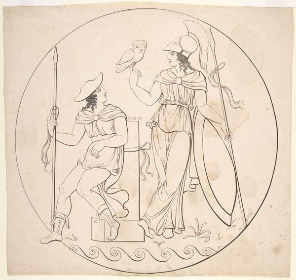 Curator: This work, entitled "Four Actors in Heroic Costume, with a Study of a Helmeted Head", dates from around 1711 to 1722 and is attributed to Claude Gillot. It’s currently housed here at the Metropolitan Museum of Art. I am immediately drawn to the delicate line work and washes. What are your initial thoughts? Editor: Well, I'm intrigued by the labor invested here, evident in the detailed depiction of costumes and armor. Look at the various decorative additions to their helmets; one even sports what appears to be a plume or small bird. These additions are telling, given this seems to represent performance. Curator: Absolutely, and if we focus on the composition, the figures are arranged almost like a frieze, creating a sense of theatrical staging. Gillot clearly demonstrates a firm grasp of baroque aesthetics. Editor: But baroque wasn't merely aesthetics; it was a process. Considering this work as preparatory drawing, one begins to imagine the textile sourcing, pattern-making, and skilled seamstress involved in bringing such intricate costume design into being. These characters are certainly a form of performance and labor. Curator: True, the dynamism inherent in baroque art finds an interesting echo when contemplating that material production. Notice how Gillot uses line weight and cross-hatching to convey depth and volume. What strikes me, too, is the contrast in how Gillot has colored their chainmail with hatching versus the solid planes on other clothing. Editor: Indeed, those choices would reflect specific material costs. The accessibility of particular dyes to theatre companies back then would significantly dictate design. And consider the physical implications of these garments, limiting performers’ mobility. Even artistic constraints have material origins. Curator: The elegance and flamboyance capture the sensibility, and I believe the artistry lies in the meticulous detailing and balanced distribution of the figures across the plane, emphasizing their shared, yet distinct identities through ornament. Editor: I'd argue that Gillot's choices reveal an interconnected web of creation – from sourcing pigments to staging theatrical spectacle – which is fascinating when considering the work as evidence of cultural manufacturing and social position during that period. Curator: I think we both walked away with deeper understanding. Thank you for exploring Gillot’s work with me through an intriguing lens. Editor: Thank you. Seeing those players reminds us art manifests both in visual form and labor's presence, an insightful tension worth honoring.
