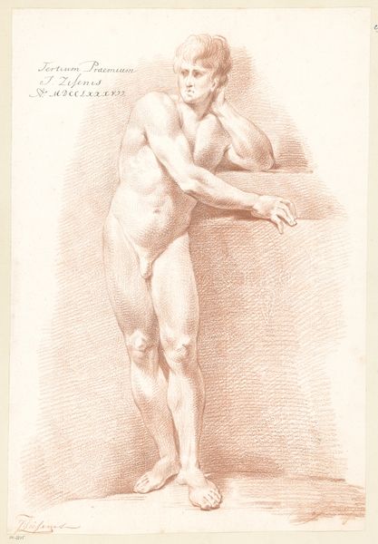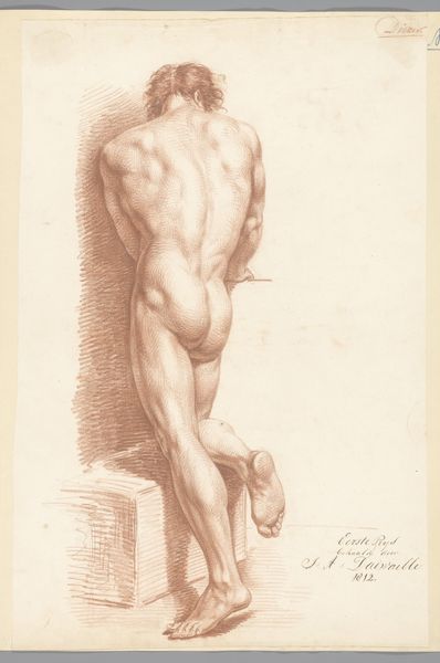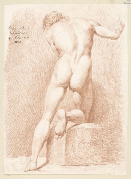 Izaak Riewert Schmidt created this nude drawing in 1805 using pen in brown ink. During the late 18th and early 19th centuries, the male nude was a central subject in academic art, reflecting both a reverence for classical ideals and the construction of masculinity. Here, the figure is seen from behind, emphasizing the musculature of his back and limbs. The drawing isn't just a celebration of the physical form; it's a reflection of the power dynamics inherent in the act of looking. Traditionally, the male gaze has dominated art history. Schmidt's drawing can be seen as perpetuating, or perhaps subtly questioning, these established norms. The male nude can reflect societal ideals of strength, beauty, and virility, but may also serve as a canvas to explore the vulnerabilities and objectification inherent in the human form. Ultimately, this drawing exists at the intersection of anatomical study, artistic expression, and cultural ideology.
