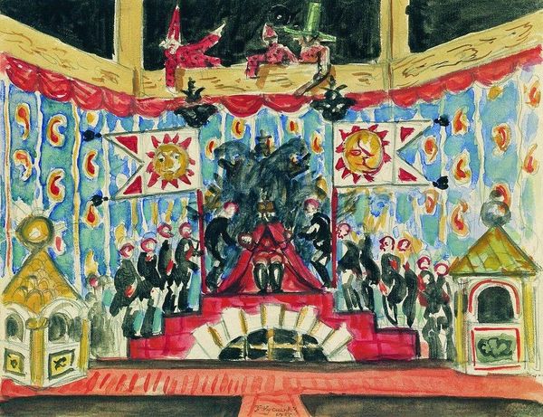 Curator: This is Hiro Yamagata’s “Four Cities Suite, Tokyo” from 1983. Yamagata worked primarily in acrylic paint and often with airbrush techniques, especially during this period. Editor: Whoa, intense! So much going on here, like a wild theatre. Is it just me or does this picture almost buzz with all the tiny people and that central arena, bright white like a stage. It's electric. Curator: The subject is a Sumo wrestling match. Think about the labor involved in these events, not just the wrestlers’ training but the manufacturing of the elaborate decorations, the banners, the seating, even those dropped balloons. Each is carefully placed and adds to the event's spectacle. Editor: Dropped balloons? Those jaunty, multi-colored spheres? Okay, now I’m imagining all these stoic Japanese businessmen hurling them into the ring – feels wonderfully surreal. It really opens up a strange perspective – everyday existence bursting into some extraordinary performative drama. Curator: Precisely, this speaks to the social dimension. These Sumo matches were significant social and economic gatherings. The wrestlers themselves, figures of almost mythical status in Japan, endorse brands and are sponsored by powerful corporations. Look at those banners hanging above. Editor: Good point about those brands; I hadn't fully processed those yet! The flags definitely suggest something more than *just* sport – almost a fusion of sporting event and commercial expo? The artist blurs all this by having so much action happening; what's significant and what isn't? Curator: Exactly! Yamagata highlights that inherent blending. The very composition draws attention to both the center-stage ritual and its embeddedness within layers of commerce, leisure, and national identity. The acrylics enable him to build a bright, clean image. Editor: Looking at it from that perspective – like a woven tapestry of culture and cash – really makes you re-think the event, doesn't it? There's definitely this dynamic tension here. You initially see wrestlers competing but there’s this whole ecosystem there as well! I now wonder who’s "winning". Curator: Precisely the question Yamagata provokes. His choice of bold color and simplified form invites us to consider these multi-layered relationships. Editor: This has transformed what I originally felt was just an energised and energetic painting into some intense social critique, or some dynamic portrait of contemporary Japanese life... very cool. Thanks!
