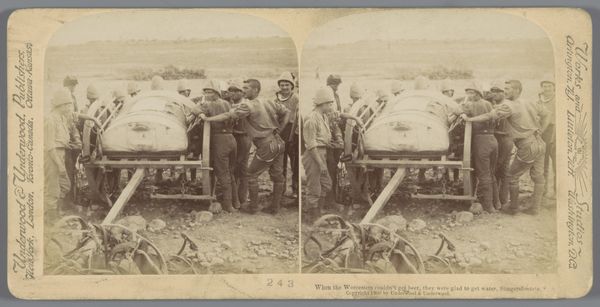 Editor: This gelatin-silver print, taken in 1915, is titled "Eene batterij van de beroemde 75er gereed tot schieten opgesteld," and the credit goes to Semaphore. I’m struck by how ordinary the scene appears, even with cannons lined up ready to fire. What's your interpretation of this piece? Curator: What immediately grabs my attention is the emphasis on production—the sheer materiality of these cannons, their manufacture and deployment amidst a pastoral landscape. Note how the technology of war, built from raw materials extracted and shaped through labor, intersects with the social and economic landscape. Editor: So, it's not necessarily about the impending battle, but about how those cannons came to be there in the first place? Curator: Exactly. The photograph prompts us to think about the network of labor that supports this weaponry. Who mined the metal? Who built the wheels? The title highlights their status as "the best" – which implicitly acknowledges industrial and colonial competition for resource exploitation, and production quality within the conflict. Does seeing it this way change how you look at the scene? Editor: Definitely. I hadn’t thought about all of the human effort it represents, the industrial machine necessary to put those cannons there. Now I see it less as a moment of readiness, and more as a culmination of countless actions. Curator: Precisely. Consider also the photographic medium itself—a product of its own industrial and chemical processes. It serves to document, but also subtly implicates itself within this network of production and consumption. We need to consider what meaning the image carries for viewers and actors at the time. What kind of social or propagandistic function may the picture play? Editor: I see it now; looking at the materials and means of production reveals a whole new dimension to the artwork’s meaning.