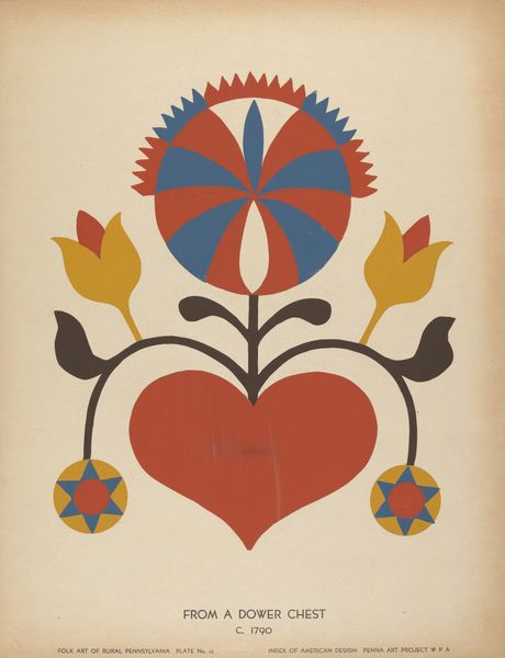 This print showcases Pennsylvania folk art motifs drawn from stove plates, cake molds, and ceramics. Notice how stylized tulips and hearts dominate these designs, echoing symbols found across Europe. The tulip, in particular, is not merely a flower here; it is a potent emblem of life, love, and faith. It migrated through Ottoman and Central European art, often signaling prosperity and the ephemeral nature of beauty. Observe the heart: universally understood as the seat of emotions, yet its visual representation has evolved. In ancient times, similar shapes were linked to foliage and fertility, reflecting humanity’s enduring connection with nature's bounty. These symbols resonate deeply, triggering collective memories. The heart, for instance, stirs not only romantic notions but also primal connections to life's origins. The tulip, with its upright stance, becomes a visual echo across centuries, a testament to the power of images to transcend time, continually revived in our cultural consciousness.