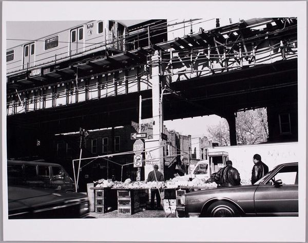 Editor: Here we have Robert Frank's "Exterior of Freemont Hotel--Los Angeles," a black and white photograph taken around 1955 or '56. It shows a cityscape dominated by the Freemont Hotel under construction, and holiday decorations create this oddly disjointed festive-yet-industrial feel. How do you read the image? Curator: What strikes me immediately is the process – the very *making* of Los Angeles evident in this unfinished hotel. Frank isn't romanticizing the city. He shows it raw, built by labor, block by concrete block. Even the celebratory wreaths feel…manufactured, almost as if the holiday cheer is also being constructed. Editor: That's an interesting perspective! I hadn't thought of the wreaths as also 'manufactured,' but I see what you mean. Does the photograph imply any commentary about this "making of" Los Angeles? Curator: Absolutely. Notice how the 'Valet Cleaners 121' sign almost blends with the larger structure; the photo puts labor—from the construction workers building the hotel to the unseen hands of the cleaners—into the frame. We should also note that street photography often captured what was being glossed over in mainstream publications. Frank may want us to confront labor realities hidden in plain sight. Editor: That's thought-provoking, it brings new meaning to the "street photography" classification that has been given to this artwork. The image documents not only the "how," but possibly, "at what cost." I’m left wondering who inhabited or labored within these spaces. Curator: Precisely. The visual language Frank employs highlights those material processes and the underlying conditions. Editor: I’ve always considered the "what" and never focused so much on "how" and the story behind that "how." Thank you! Curator: It’s all about interrogating what's *behind* the image itself. Thanks for asking.