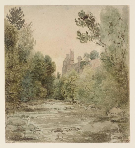 Curator: Peter De Wint's watercolor, titled "Knaresborough Castle," captures a landscape dominated by the ruined castle overlooking the River Nidd. Editor: It has a solemn, almost melancholy quality, doesn't it? The muted palette and crumbling architecture evoke a sense of loss and the passage of time. Curator: Indeed. Knaresborough Castle's history is steeped in power struggles and sieges. De Wint painted this, perhaps reflecting on the futility of such conflict. The castle, once a symbol of Norman strength, is now reduced to picturesque ruins. Editor: The composition is also quite telling. The strong verticality of the remaining tower juxtaposed against the horizontal river suggests a tension between permanence and change, doesn't it? Curator: I see that as well. The romanticism in ruins underscores the narrative of human impact on the landscape, but nature's resilience through the trees on either side brings about a harmony. Editor: In the end, it's a powerful piece where technique and historical context merge to form a resonant statement about history, power, and nature.