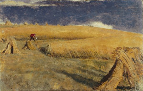 Curator: Wilhelm Trübner's "Stubble Field with Ascending Path near Wessling," created in 1876, invites us to consider rural life in 19th-century Germany through oil on canvas. Editor: The immediate impression is one of subdued quiet. The overcast sky dominates the canvas, casting a rather somber light across the landscape. The ascending path hints at labour, a connection to the earth, yet there's also a sense of isolation. Curator: Precisely, it presents a carefully constructed image rooted in the realities of its time. Consider the burgeoning industrial revolution and its impact. Representations of the rural took on different political weights, referencing an era when industrialization fostered complex rural transformations. Editor: It makes me consider issues of land ownership and class during this era. The buildings on the horizon – perhaps a farmhouse or a smallholder’s dwelling – invite questions about who labored here, who benefited, and how such work intersects with representations of the sublime or picturesque found elsewhere in landscape art. Curator: It's relevant to think about the socio-economic factors, especially since Trübner, though associated with Impressionism and known for plein-air painting, departed in notable ways from many contemporary movements of his time. How does he use technique to offer visual cues to these issues? Editor: The earth tones feel weighted down with a heavy mood that resonates, a reflection of hardship but perhaps, more significantly, quiet resistance. We are also seeing the transition in landscape paintings – the brushwork becomes expressive of internal mood more than photographic precision. The buildings become muted under cloudy, moody skies. It isn’t celebrating the industrialization, or picturesque charm, but instead offers a somber assessment. Curator: And thinking intersectionally, we must examine how access to this landscape might be experienced according to class or gender at that time. For Trübner, the image allowed space to comment on the transformations to traditional ideas of property. Editor: Absolutely, viewing art in context enables us to not only examine art as aesthetic expressions but as complex, embedded social texts that still challenge us. Curator: Indeed. Engaging in this critical process ultimately transforms art from silent object to active participant in historical dialogues, furthering our insights regarding societal forces.