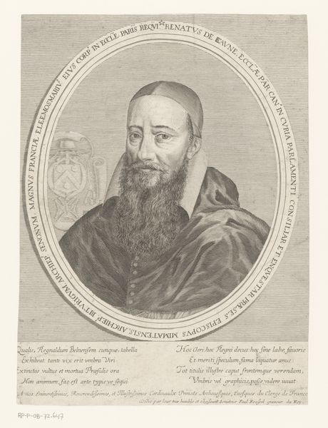 Editor: So this is "Jean-Pierre Camus, eveque de Belley," made sometime between 1605 and 1650, currently at the Met. It’s a print, so lines are the medium... It feels very formal and distant, typical of portraiture of the era. What do you make of it? Curator: Beyond the conventions of formal portraiture, let’s consider the social role Camus held as Bishop of Belley. Portraits of religious figures at this time often served to reinforce power structures. How might this image function as a representation of authority and faith in the context of religious and political upheaval? Editor: Well, his gaze is direct, and that huge cross…it's definitely a symbol of power. But what about the frame around the portrait itself? The inscription, is it celebrating or maybe…constraining him? Curator: That's a sharp observation. The inscription indeed functions on multiple levels. On one hand, it praises his role as "Prince of the Church" but think of it in a social construct. Consider who would be producing and consuming this image. Was it meant to inspire reverence amongst the masses or reinforce his image amongst his peers? Editor: I didn't consider the audience. I suppose that limits a simple celebration/constriction reading of it. Curator: Exactly! What does that say about the relationship between art, power, and social structures during this era? Are artists complicit or subversive or something in between? Editor: It feels like they are a bit of everything, really. Context is so important. I see so much more now; thank you for clarifying that! Curator: And thank you for prompting a crucial discussion about art's function in society. I appreciate you digging deeper into this artwork.