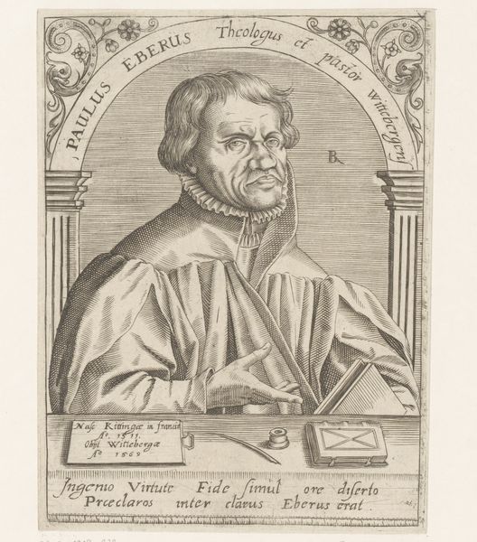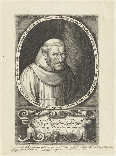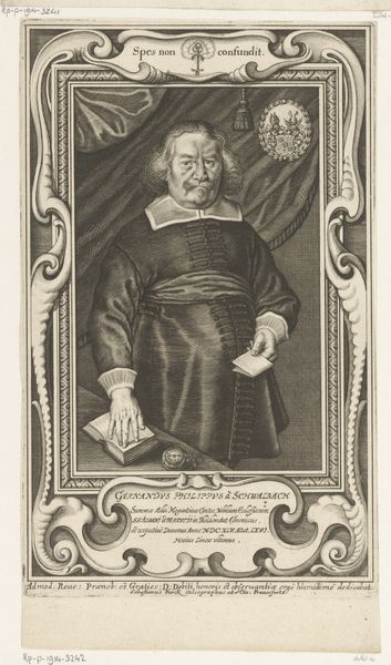 Editor: Here we have "Portret van Balthasar Friedrich Saltzmann," an engraving dating from between 1672 and 1717 by Johann Adam Seupel. It's currently housed at the Rijksmuseum. The intensity in the subject’s eyes and that striking Baroque frame… It makes me wonder, what are we meant to understand about Saltzmann’s role in his society through this piece? Curator: That's a great question! This portrait operates within very specific visual politics. Think about it: engraving, as a reproducible medium, makes this image of Saltzmann widely accessible. Consider how that accessibility functioned. It not only memorializes him but also reinforces the authority and position of the clergy within the social structure of the time. What's highlighted isn’t just his likeness, but his *function* as a religious leader. Editor: So it's less about him as an individual and more about him representing something bigger? Like an ideal? Curator: Exactly! The inclusion of the Latin inscription "OMNE PECCATUM CRUCIFIGAT IN TE" (May the cross crucify all sin in you), plus the crucifix in the background, underscores that explicit aim. The portrait is essentially a visual tool to promote faith, with Saltzmann functioning as a facilitator between the divine and the viewer. How do you think that purpose changes how we might appreciate it today? Editor: That’s really interesting. Knowing its intention allows me to look past the individual and consider the artwork as a historical artifact shaped by specific religious and social intentions of that era. I didn't fully recognize it as more of a promotion piece at first glance. Thank you for your help! Curator: Absolutely, the portrait speaks volumes about power, image-making, and the social function of art within the historical moment. Always question whose voice we're really hearing!
