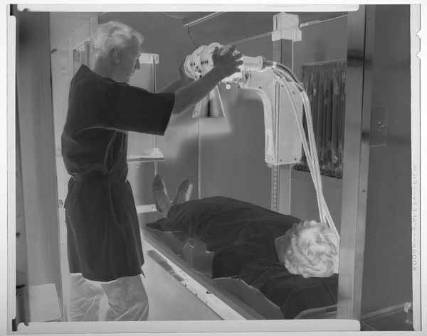 Curator: Martin Schweig’s untitled photograph captures a moment within a medical trailer: a man adjusting an x-ray machine over a woman. Editor: The stark contrast immediately strikes me—a world rendered in sharp blacks and whites. It evokes a feeling of clinical detachment. Curator: Consider the historical context. Portable x-ray units emerged during wartime, enabling mobile medical evaluations, crucial for public health initiatives. Editor: Yes, and the composition, almost claustrophobic, directs our gaze to the figures, isolating them within the confines of the frame. Curator: It speaks volumes about access to healthcare during uncertain times and reminds us of the socio-political dimensions of medical technology. Editor: Absolutely. And that single light source, illuminating the subjects, heightens the drama. The tonal gradations add such depth. Curator: Such imagery played a pivotal role in disseminating medical knowledge and shaping public perception of health and disease. A powerful thing. Editor: Indeed, Schweig creates a captivating image that invites us to confront the intersection of medicine, technology, and human vulnerability.