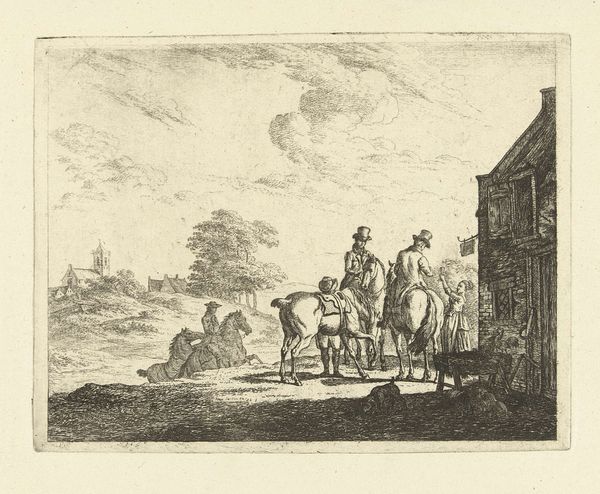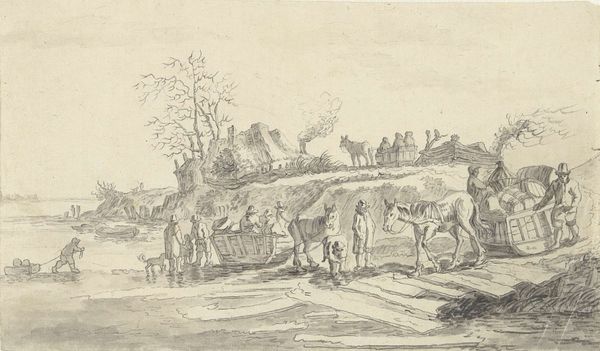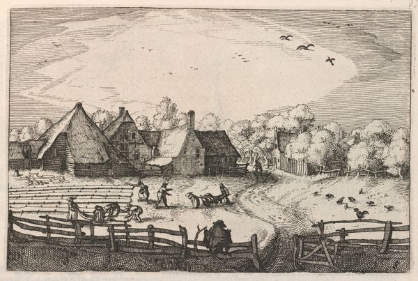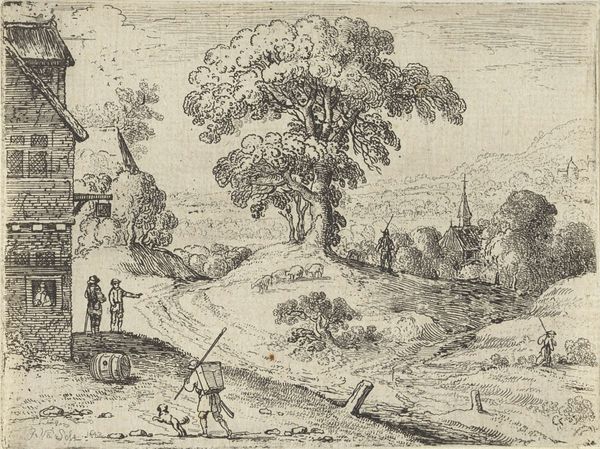 Editor: So, this is Claes Jansz. Visscher's "De weg naar Leiden," created sometime between 1612 and 1652. It's a drawing and print, combining etching and pen techniques. The sheer detail in such a small work is incredible! What symbols jump out at you in this landscape? Curator: The overarching symbol is, quite simply, the road itself. It's not just a path to Leiden, but a representation of life’s journey, laden with cultural weight. What reads to you about it? Editor: I notice that the people on the road are really small compared to the landscape, which creates a sense of human insignificance in the grand scheme of nature. Curator: Precisely. And how do you interpret that insignificance in relation to the recurring motif of windmills in the background? Editor: Well, the windmills, to me, show the relationship with human endeavors with harnessing the land... It feels optimistic and humanistic somehow. Curator: Indeed, the windmills carry multiple layers of meaning. On one level, they show the Dutch ingenuity of transforming landscape. Simultaneously, consider their vulnerability. Dependent on the wind, on external forces, their presence becomes a reminder of fortune’s wheel and change. This introduces a quiet tension, don’t you think? Editor: That's a fascinating insight! I hadn’t considered the potential precarity the windmills suggest. So, it’s not just progress but a potentially unstable one. Curator: And notice how even the placement and activity of the figures reinforces this. Some journey together, others till the land. What message is sent to you, with these arrangements and figures? Editor: Seeing those subtle connections, like the road as a symbol of life's journey, enriches my experience. It's much more than just a pretty landscape now. Curator: Exactly! Recognizing symbols unlocks a deeper understanding of the emotional and cultural values embedded within this art.